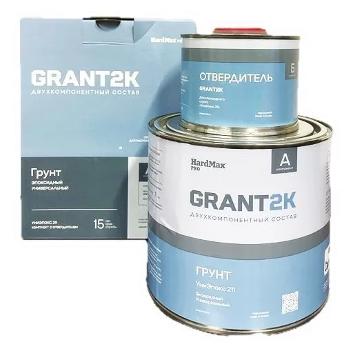 ОПИСАНИЕ Грунт УниЭпокс 211 GRANT 2К HardMax PRO Светло-серый (комплект 2,74 кг (2,4кг+0,34кг) new» Быстросохнущая двухкомпонентная грунтовка на основе эпоксидной смолы с добавлением антикоррозионных пигментов, инертных наполнителей, органических растворителей и отвердителя. Поставляется комплектно: полуфабрикат грунтовки, отвердитель и разбавитель. Поставляется комплектно: полуфабрикат грунтовки, отвердитель.